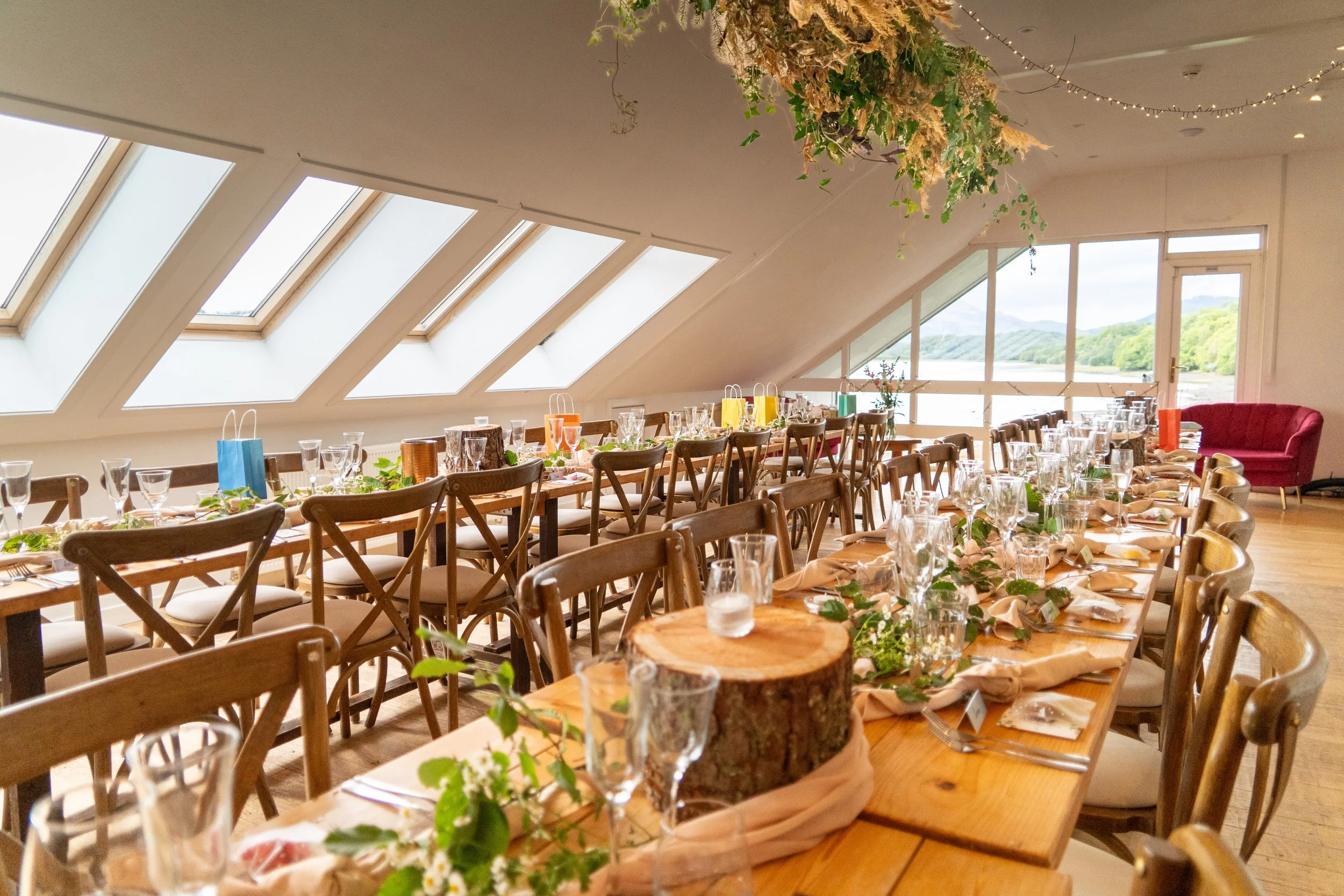 We offer a range of private dining spaces to suit any celebration. Our light-filled upstairs dining room, with large windows framing Loch Venachar and the surrounding mountains, seats up to 100 guests. The ground-floor restaurant—available for exclusive hire—offers panoramic 360° loch-and-mountain views and seats up to 80. For larger gatherings, the lakeside lawn can accommodate a tipi or marquee for up to 130. Every space is styled in our signature look, with flexible layouts and seasonal menus to match your event.